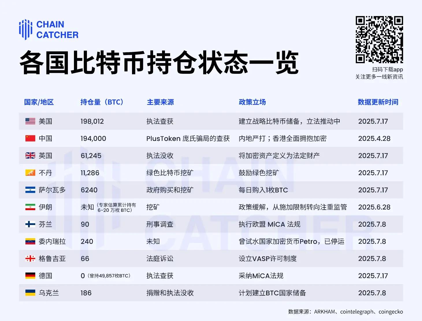 直接上干货:下表汇总了各国的比特币持仓数量、来源渠道及政策态度,速览“国家队”的加密资产版图。