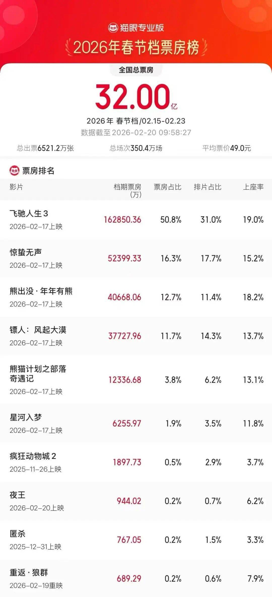 根据猫眼专业版数据,截至2月19日晚22点整,2026年春节档(2.15—2.23)总票房达32亿元。